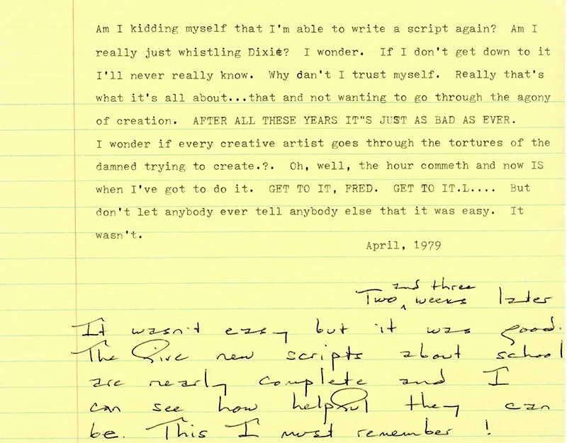 Even Mr. Rogers found the creative process challenging. We must all remember to trust ourselves and to do the work. It’s not easy. And it doesn’t get easy but as Mr. Rogers said, “Get To It, Fred” and so we must.